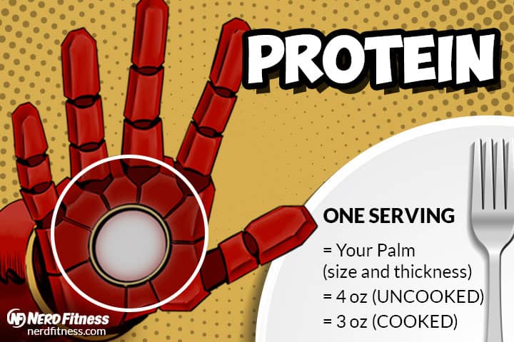For most people, it’s around 1-2 palm-sized servings of protein at each meal.