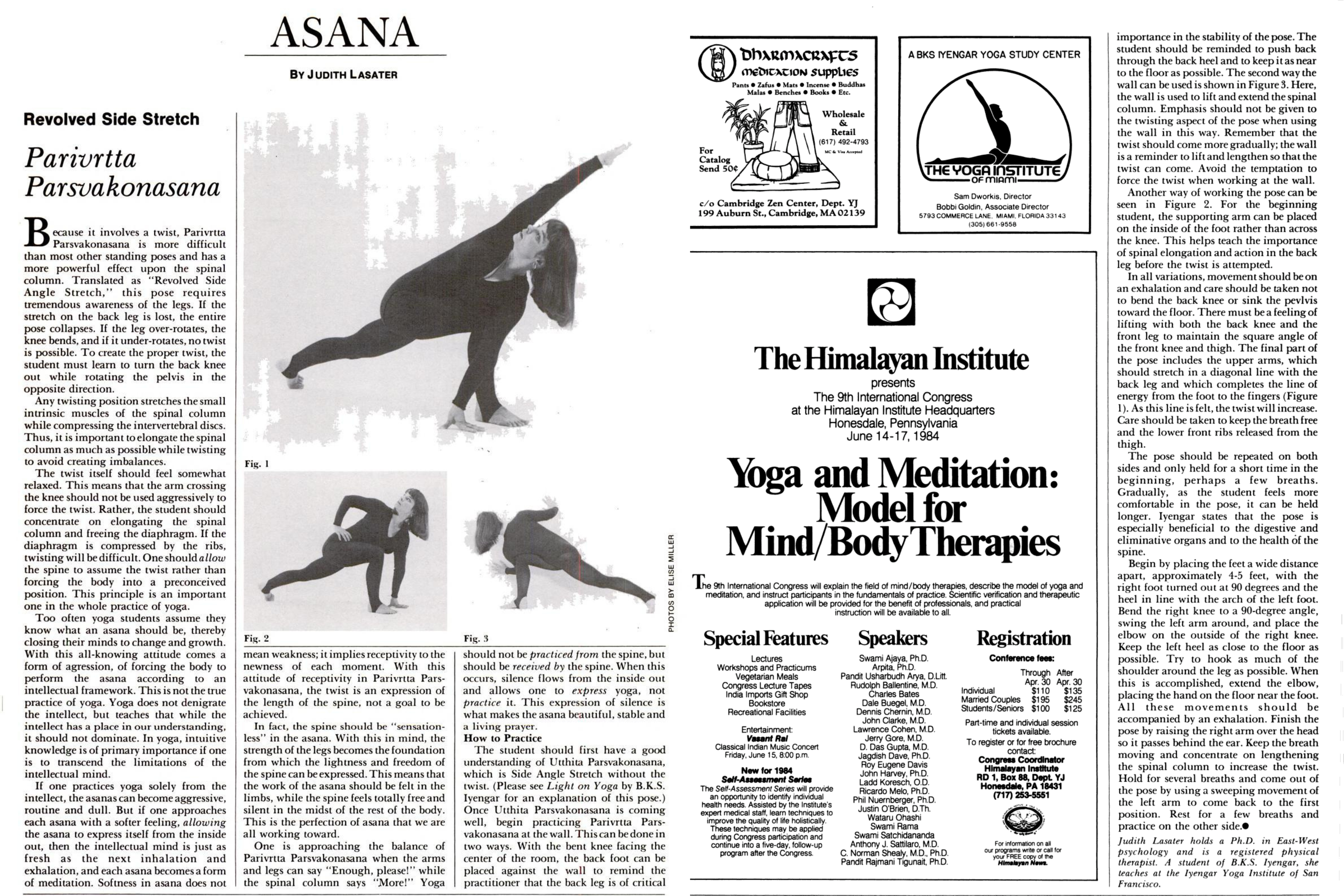 With this attitude of receptivity in Revolved Side Angle Pose, the twist is an expression of the length of the spine, not a goal to be achieved. In fact, the spine should be “sensation-less” in the asana. With this in mind, the strength of the legs becomes the foundation from which the lightness and freedom of the spine can be expressed. This means that the work of the asana should be felt in the limbs, while the spine feels totally free and silent in the midst of the rest of the body. This is the perfection of asana that we are all working toward.
