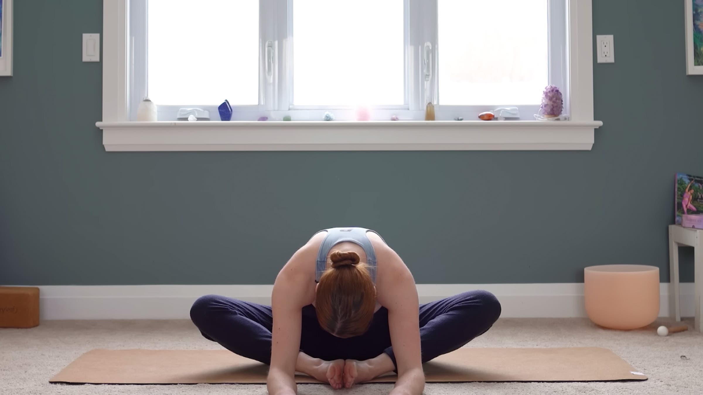 Bring the bottoms of your feet together, allowing your knees to fall apart in Bound Angle Pose (also known as Butterfly Pose in yin yoga). Hold onto your big toes with your peace fingers and pause as you squeeze your shoulder blades together and press your thighs toward the mat, creating a subtle backbend.