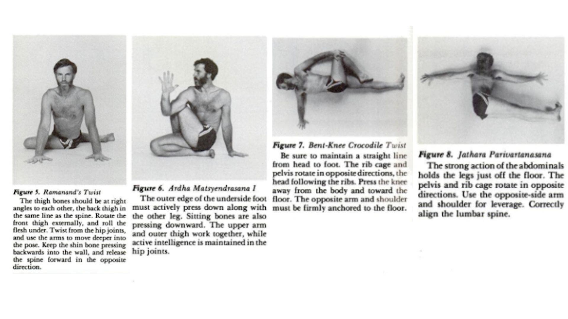 Keep the diaphragm soft, and allow the breath to flow freely. Let the poses flow from the center of the body outward as the mind moves from the outside inward. (For complete instructions on all of these twists except Ramanand’s Twist and Bent-Knee Crocodile Twist).
