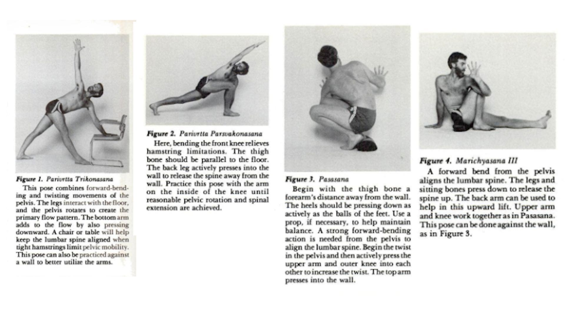 Twists begin with a rotation of the pelvis around the femur in any of three possible axes: (1) a forward-bending/back-bending movement around an axis through the hip joints; (2) a side-bending movement around an axis running through the sacrum and lower abdomen; and (3) a rotational movement around the axis through the spinal column. This last action shapes the flow patterns of all twists.
