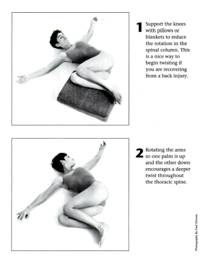 This is a good beginning movement for people who have had back pain. The two pillows or folded blankets will decrease the rotation in the spine, making the pose more accessible to those who are just beginning to move again after injury.